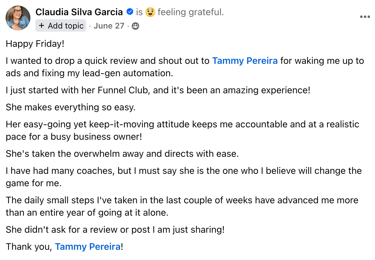 Not only do I work with incredible coaches & consultants, service-based professionals and marketing entrepreneurs to build their online businesses using Meta advertising + proven digital marketing solutions, but I also built my agency using the exact methods I teach and coach my amazing clients.